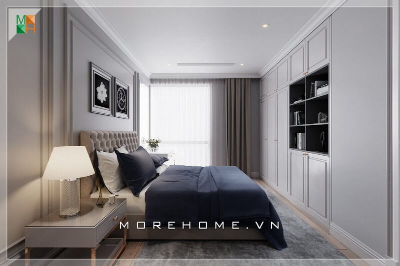 Tủ gỗ công nghiệp màu xám tinh tế, hiện đại và nhỏ gọn tiện lợi cho phòng ngủ xinh của căn hộ chung cư.