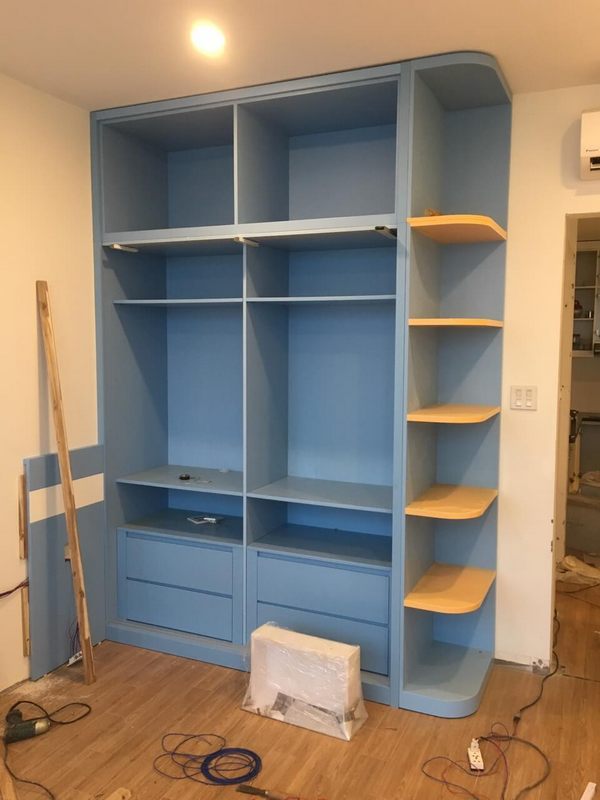 Tủ áo gỗ công nghiệp sơn đang thi công, phòng ngủ bé nhà chị Đào chung cư Thăng Long No1