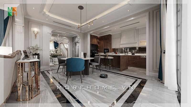 Biệt thự được thiết kế với không gian rộng mở, thông thoáng, phòng ăn và phòng bếp được liền kề nhau mà không cần sử dụng vách ngăn, tạo nên một không gian thoáng đãng và sang trọng.